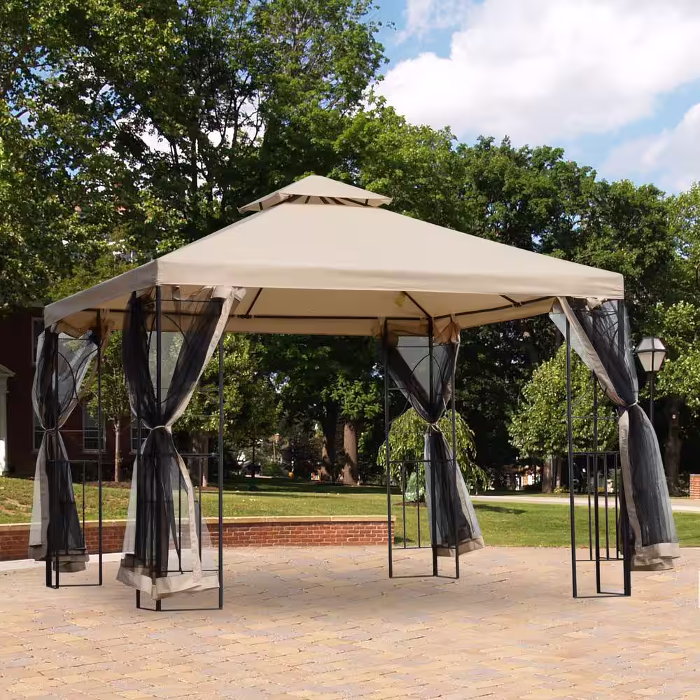 Outsunny 10 ft. x 10 ft. x 9 ft. Steel Frame Outdoor Gazebo with Mosquito Netting and Weather-Resistant Canopy Top, Sand