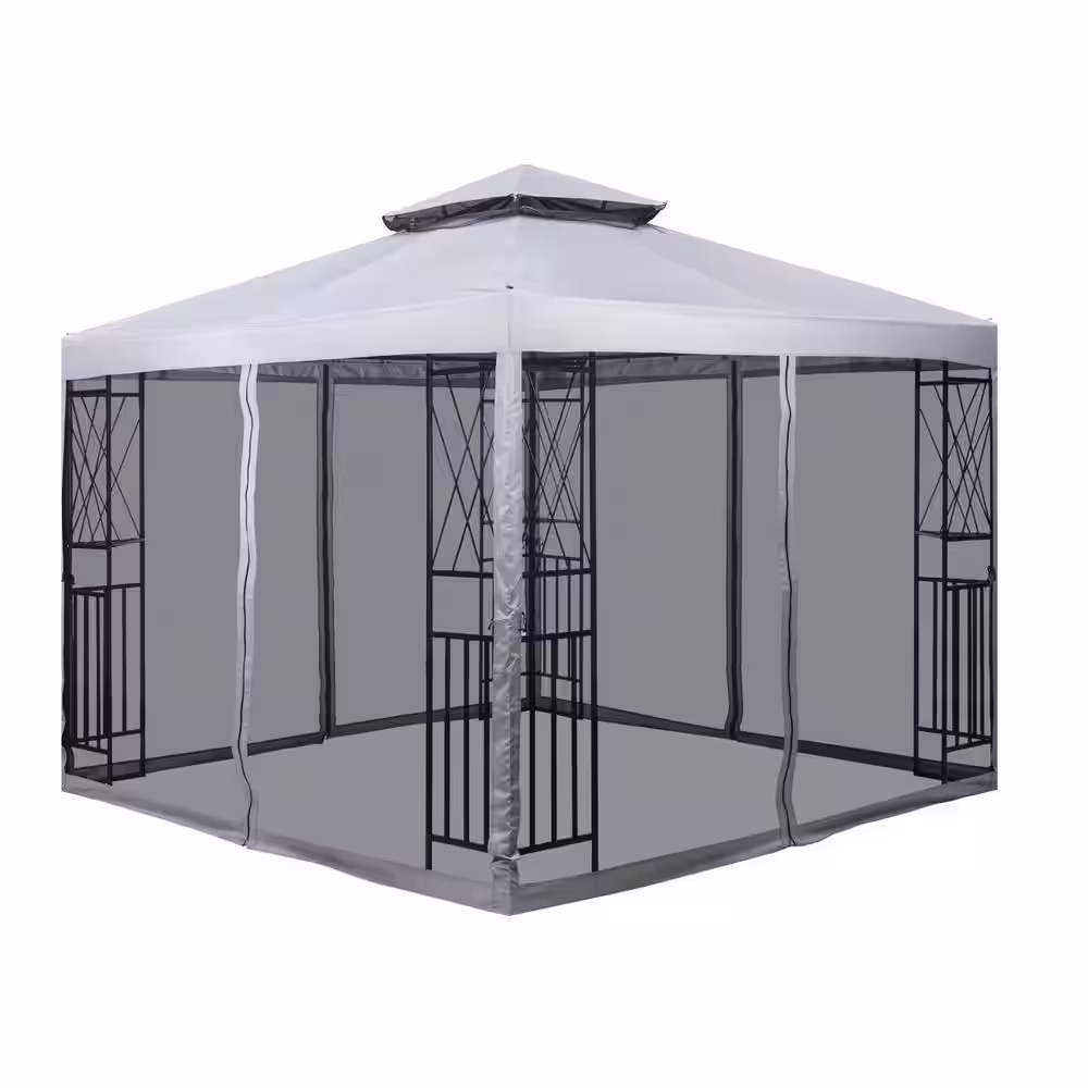 Alpulon 10 ft. x 10 ft. Light Gray Steel Frame Outdoor Gazebo with Mosquito Netting and Corner Shelves