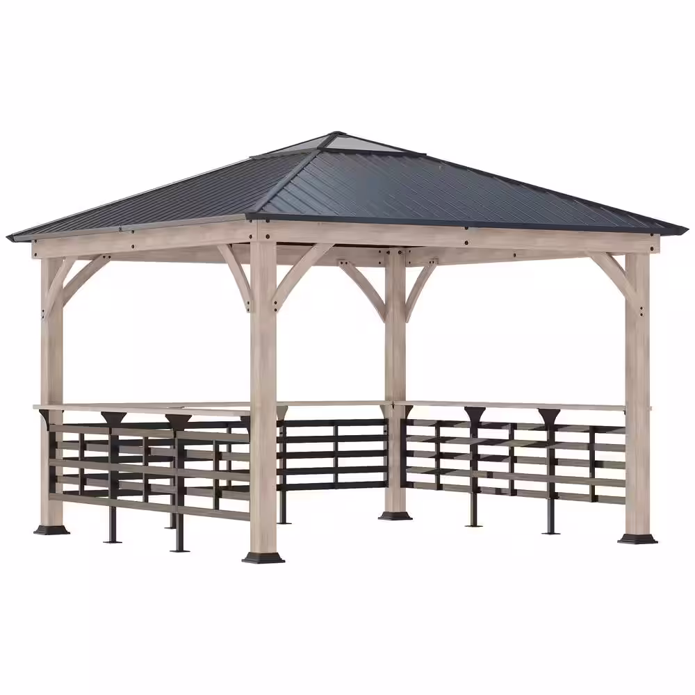 Yardistry Meridian 12 ft. x 12 ft. Premium Cedar Outdoor Patio Shade Gazebo with a 12 ft. Bar Counter and Brown Aluminum Roof