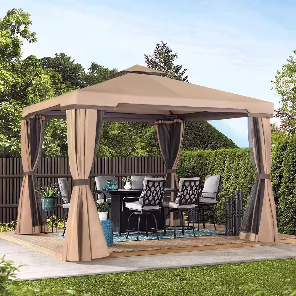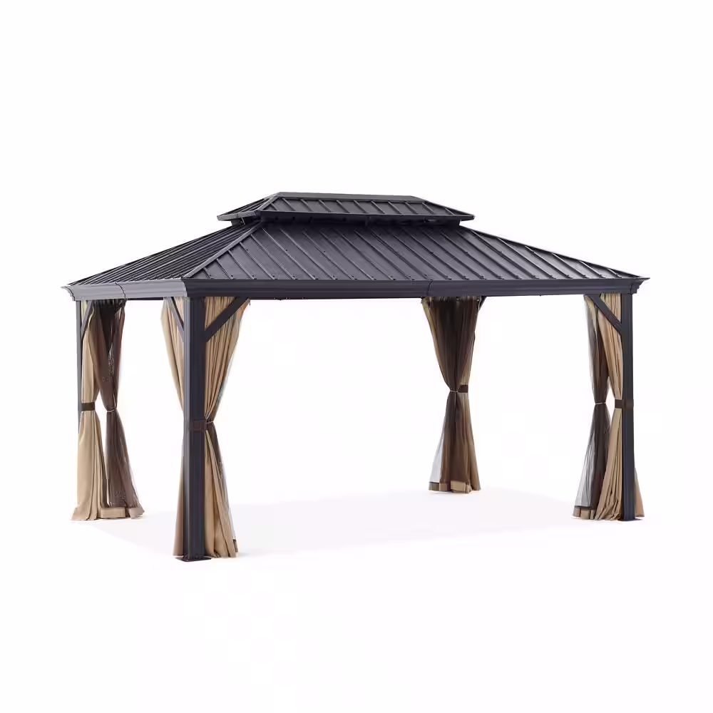 Sizzim Sizzim 10 ft. x 12 ft. Outdoor Dual-Layer Galvanized Steel Gazebo with Netting and Curtains for Garden, Patio, Lawns