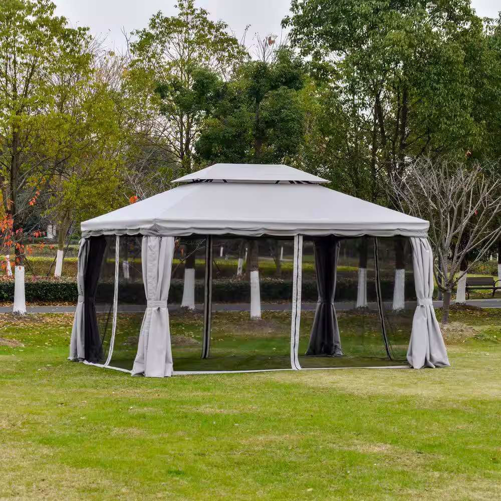 Outsunny 10 ft x 13 ft Light Grey Outdoor Patio Gazebo Canopy with Polyester Roof & Mesh Curtains