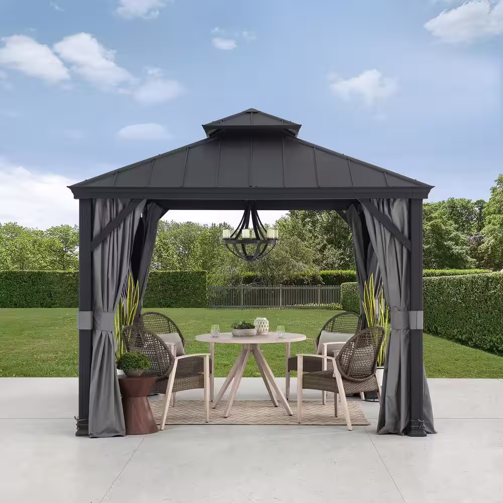 Sunjoy SummerCove 10 ft. x 10 ft. Hardtop Outdoor Patio Aluminum Frame Backyard Gazebo with Netting and Curtain