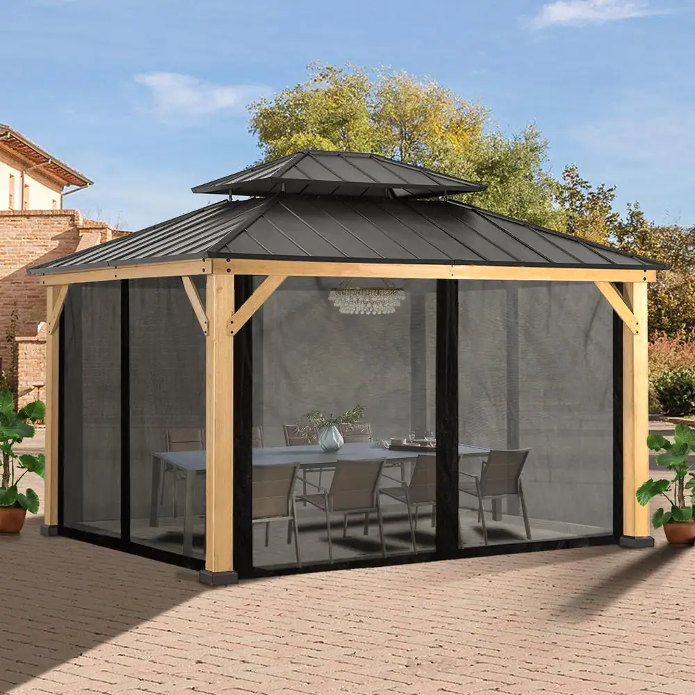 None 13 ft. x 11 ft. Spruce Wood Frame Hardtop Outdoor Patio Gazebo with Double Galvanized Steel Roof and Mosquito Netting