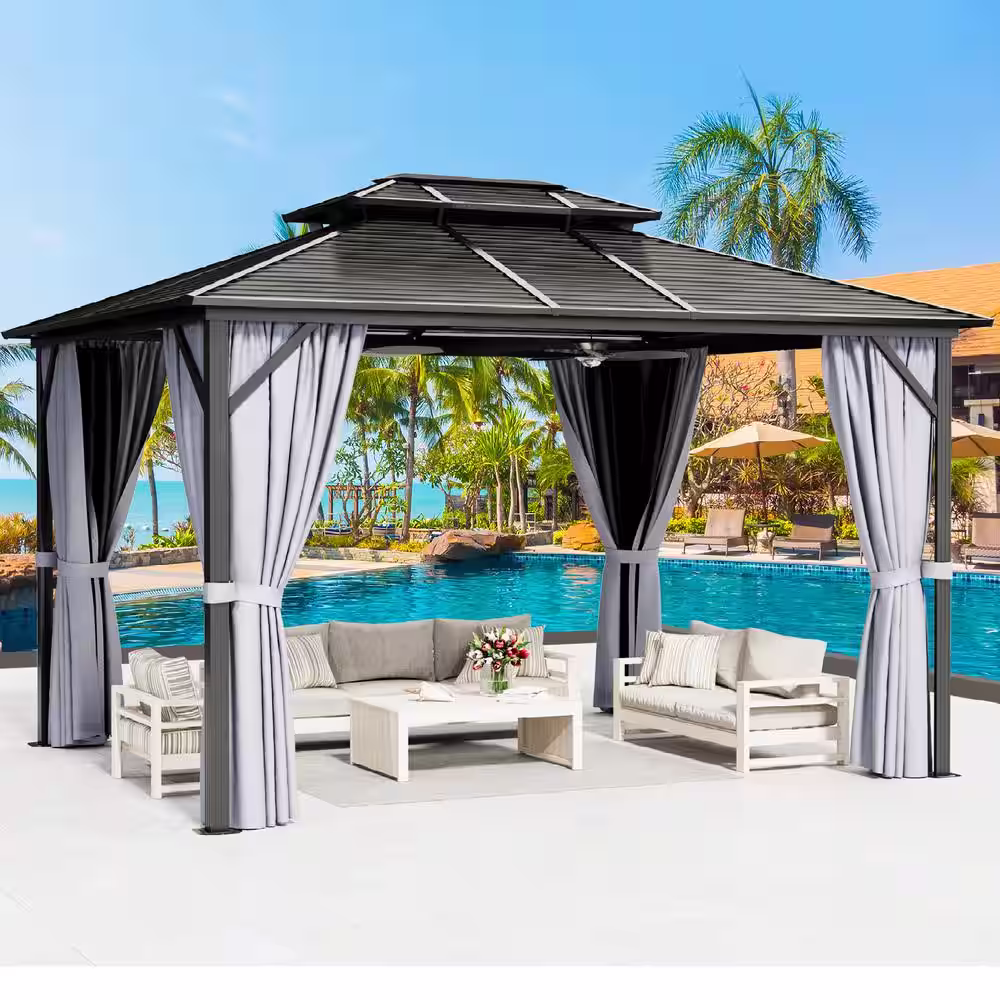 None 10 ft. x 13 ft. Double Roof Hardtop Outdoor Gazabo with Netting and Gray Curtain for Backyard and Garden