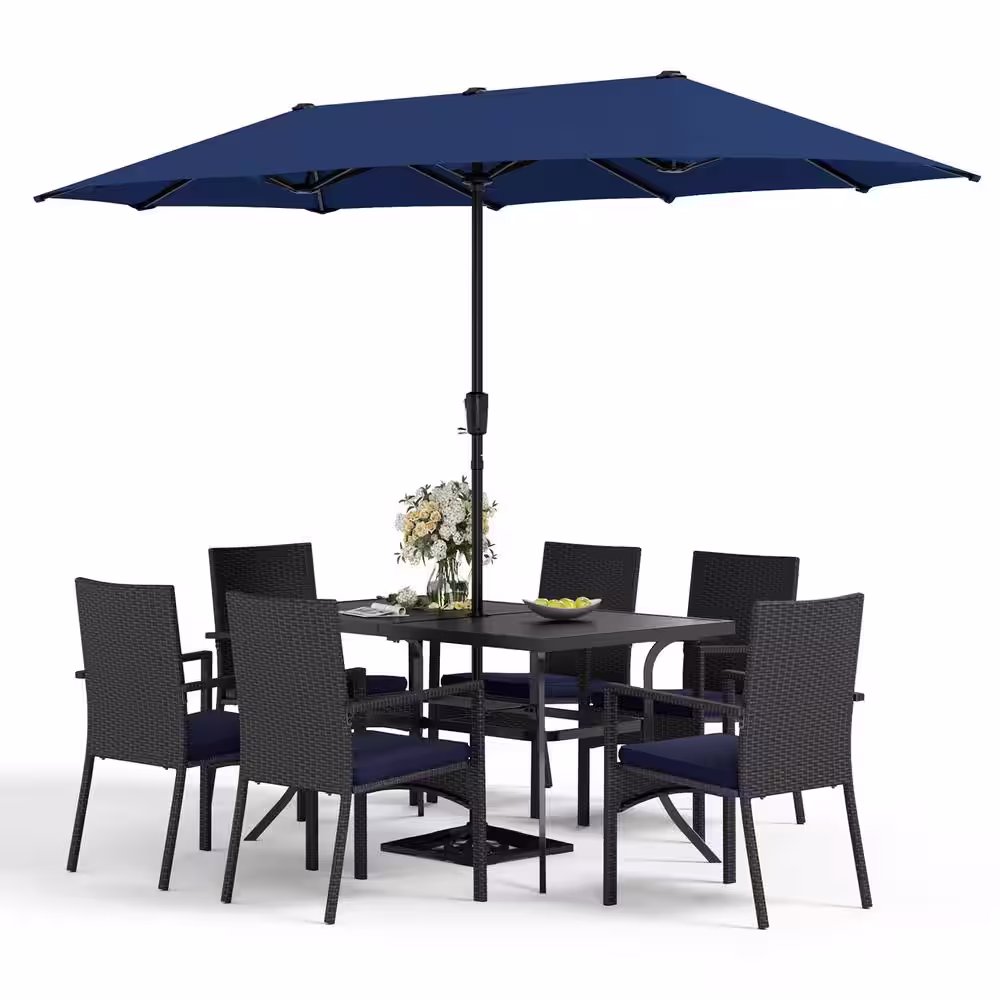 None Black 8-Piece Metal Patio Outdoor Dining Set with Umbrella and Rattan Chair with Blue Cushion