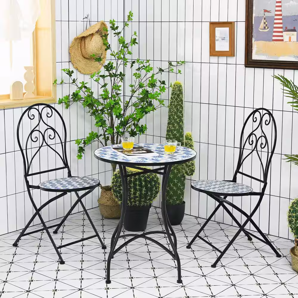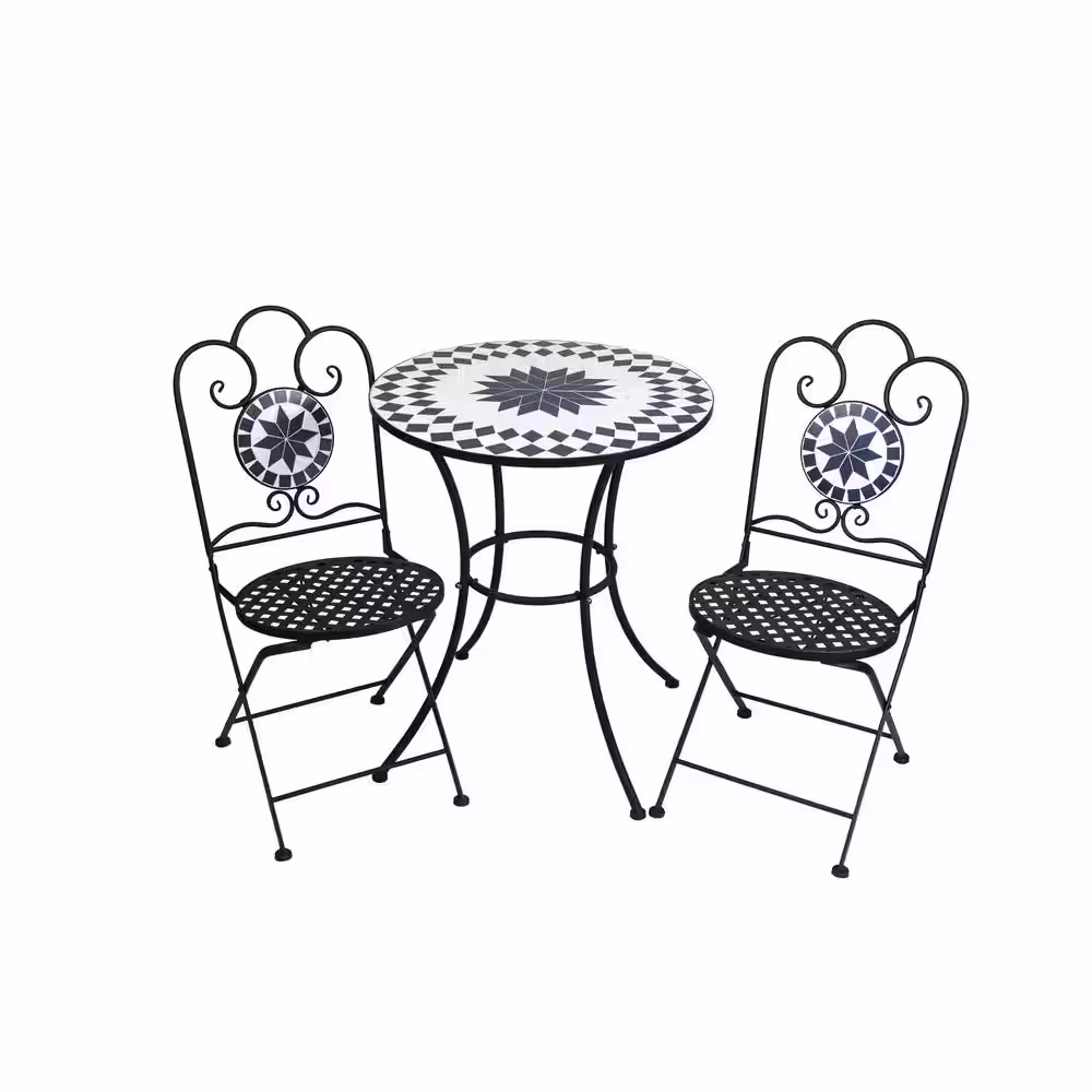 ANGELES HOME 3-Piece Metal Patio Outdoor Bistro Mosaic Design Set with Folding Chairs and Round Table