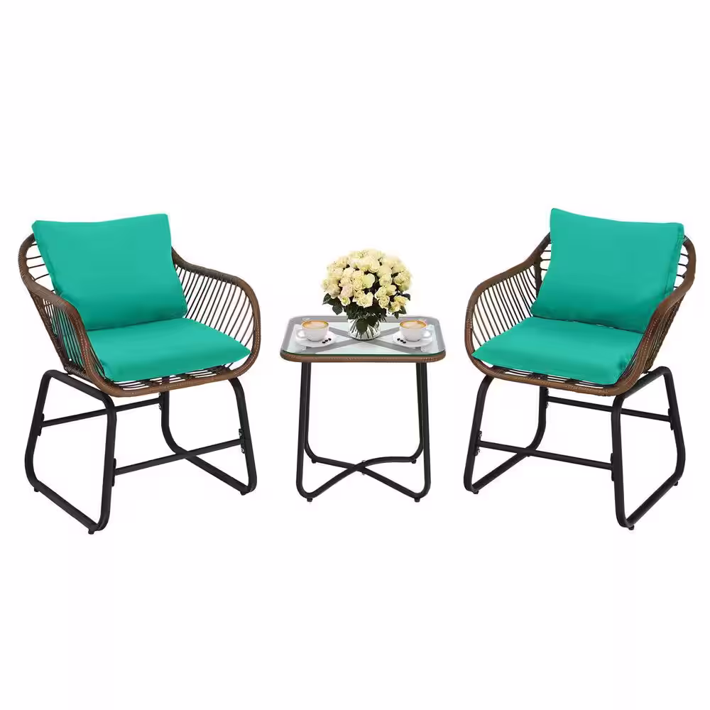 Alpulon Brown 3-Piece Wicker Outdoor Bistro Set with Turquoise Cushions