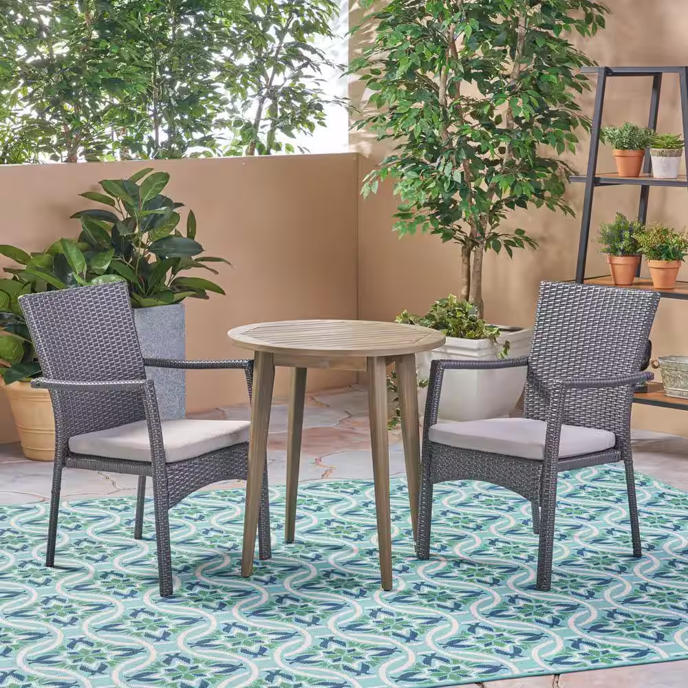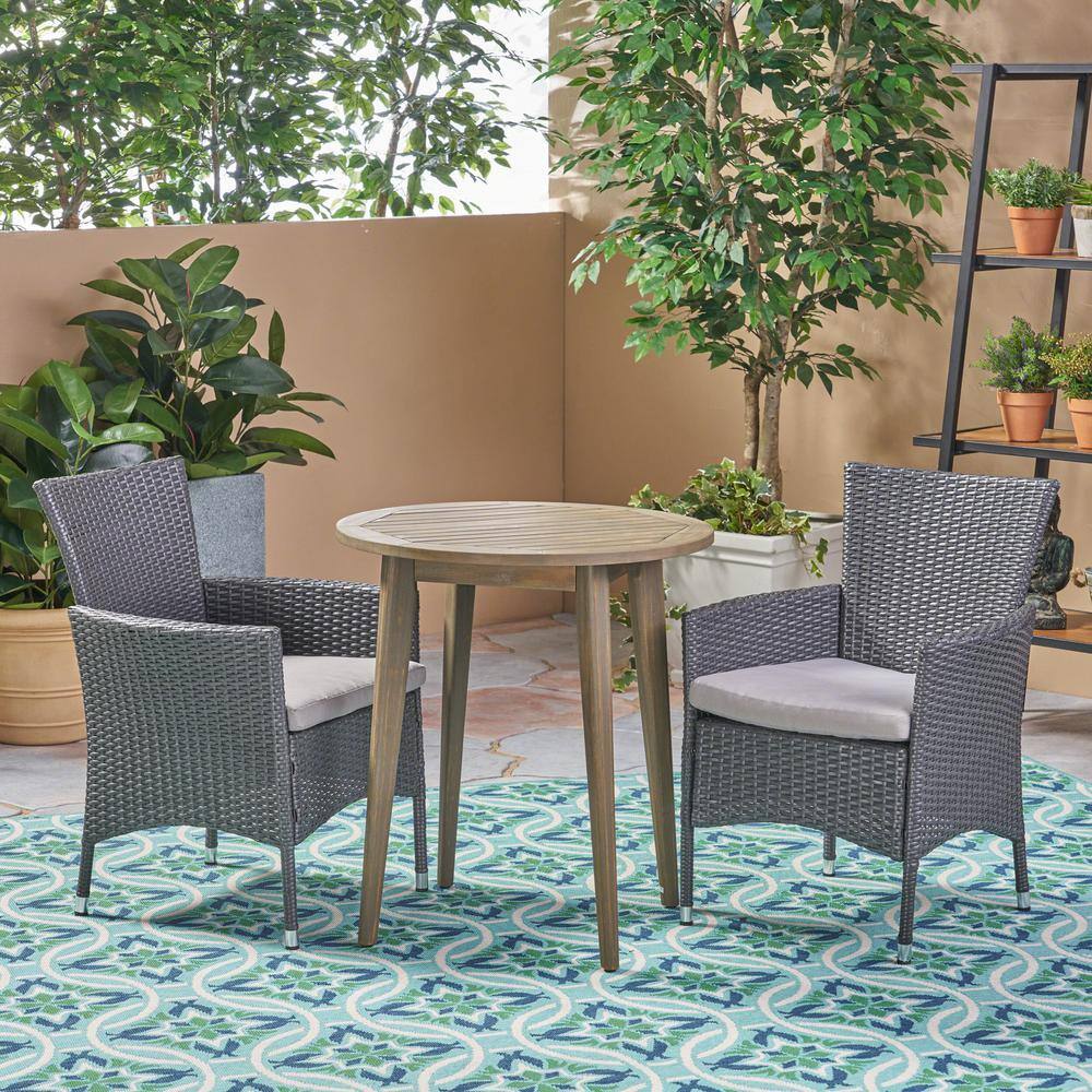 Noble House Arezzo Gray 3-Piece Wood and Plastic Outdoor Bistro Set with Gray Cushions