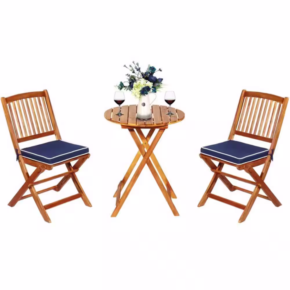 None 3-Piece Acacia Wood Foldable Outdoor Bistro Set with Navy Cushions Outdoor Furniture Set
