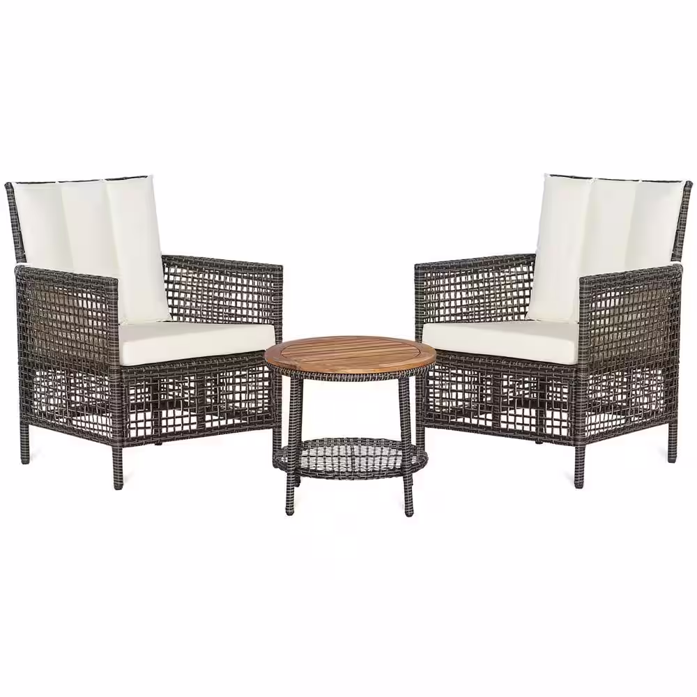 Gymax 3-Piece Wicker Rattan Patio Outdoor Bistro Set Conversation Furniture Set with White Cushions