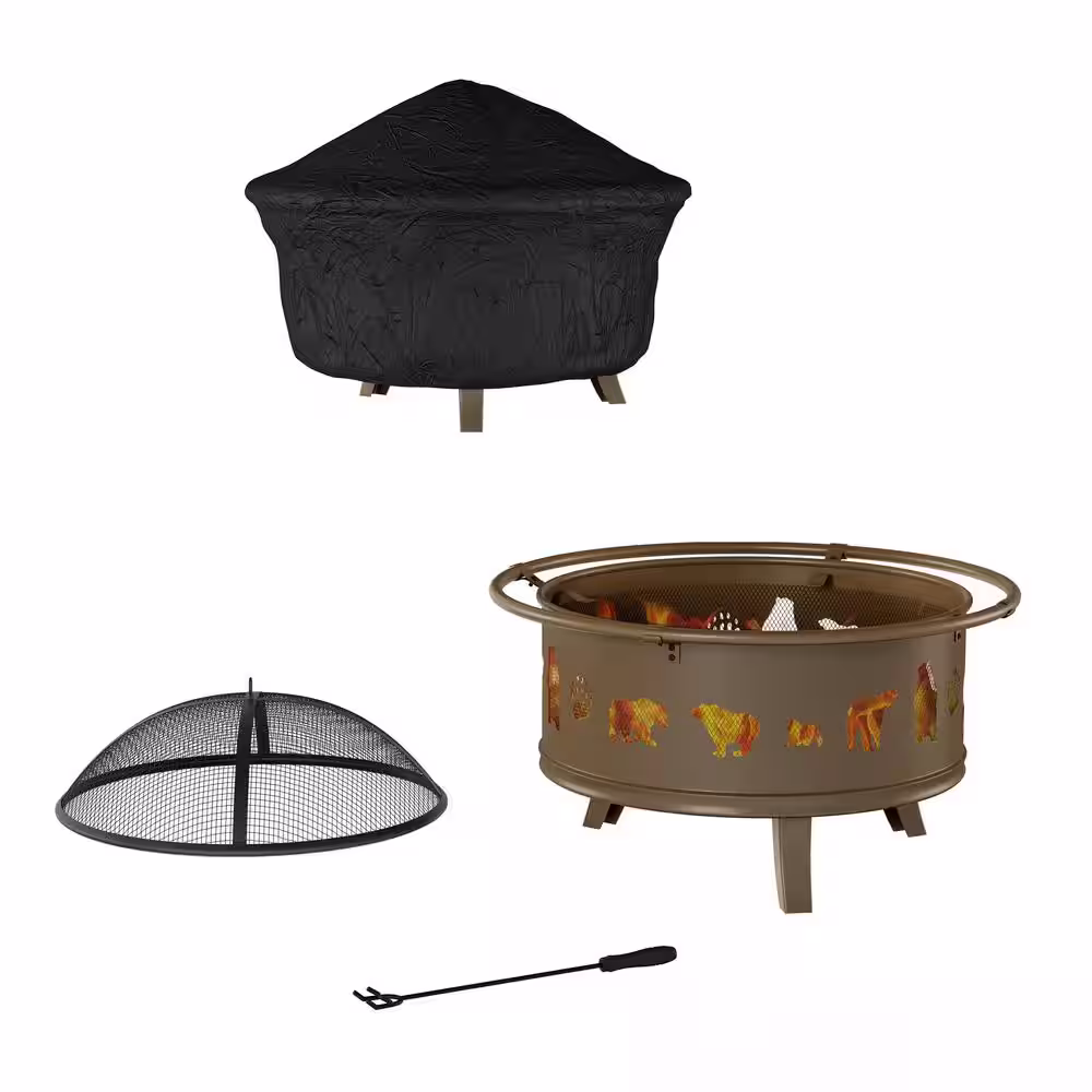 Pure Garden 32 in. W x 25 in. H Round Steel Wood Burning Outdoor Deep Fire Pit in Antique Gold with Bear Cutouts