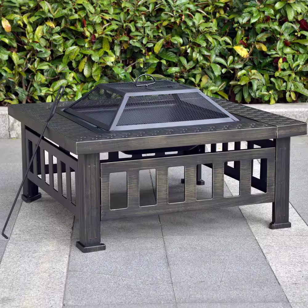 Bond Bali 32 in. W x 22.44 in. H Outdoor Square Powder Coated Steel Wood Burning Fire Pit in Bronze with Grate and Poker