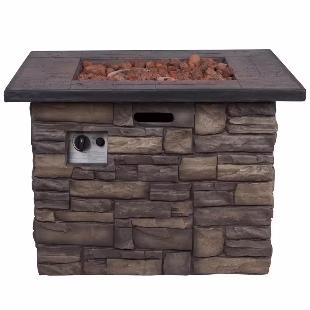 Shine Company Sevilla Square Outdoor Propane Gas Stone Fire Pit Table with Lava Rock, 34.5 in. Long