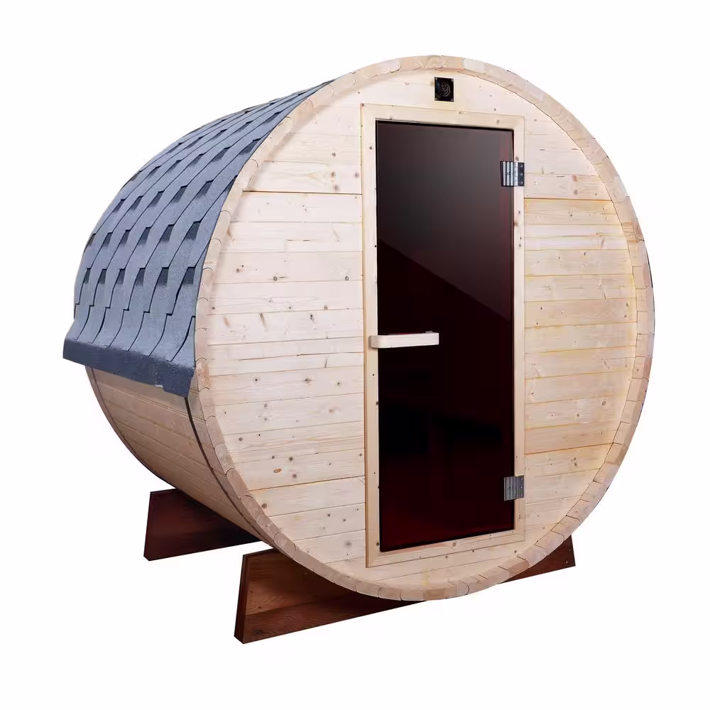 ALEKO Outdoor, Indoor Finland Pine Wet Dry Barrel Sauna 5 Person Front Porch Canopy 4.5 kW ETL Certified Bitumen Shingle Roof