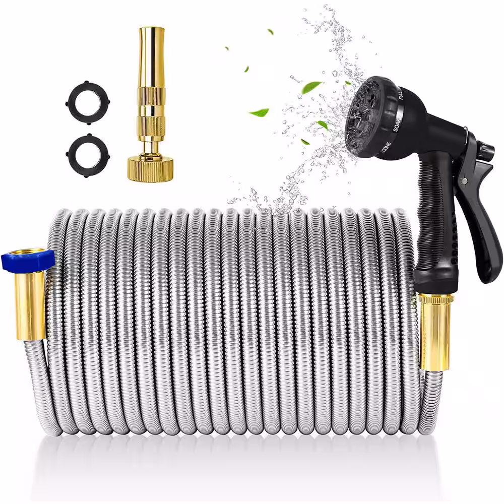 None 1/2 in. x 25 ft. Stainless Steel Garden Hose Set with Solid Brass Nozzle Outdoor Hose, Standard