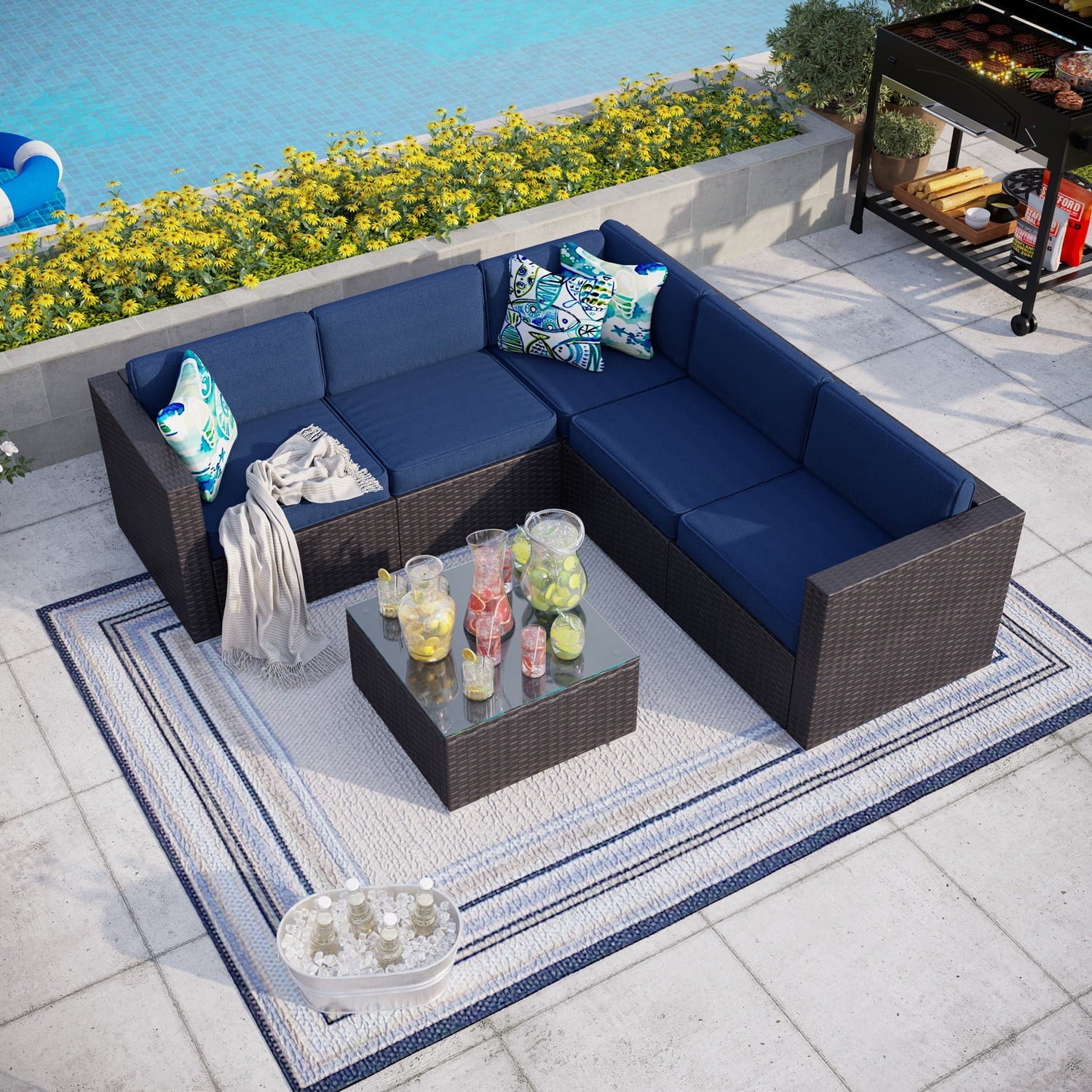 MF Studio 6 Piece Patio Sofa Set Outdoor Furniture Sectional All-Weather Wicker Rattan Sofa Navy Blue