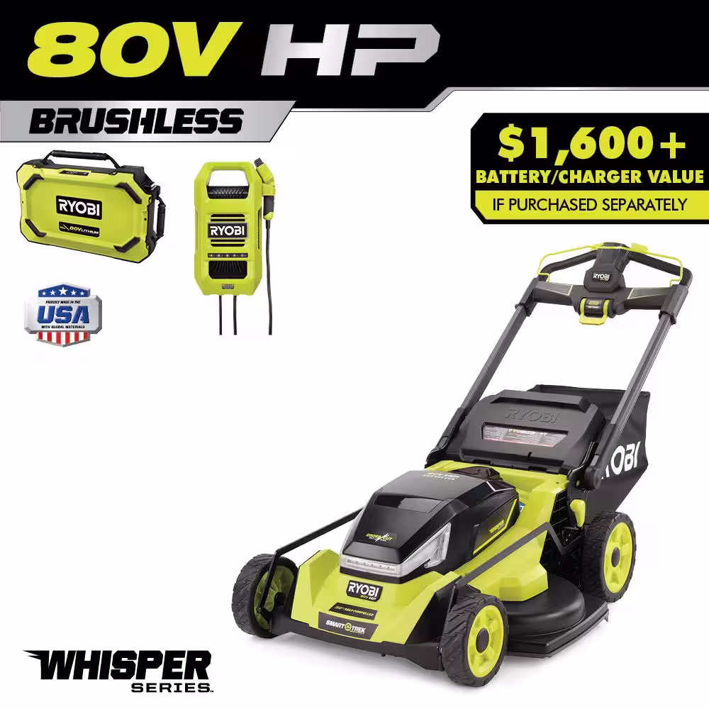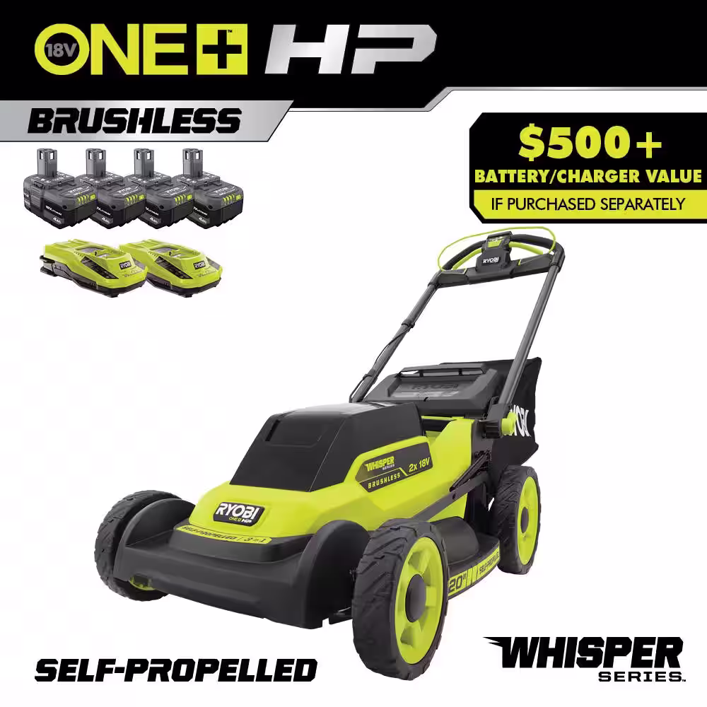 RYOBI ONE+ 18V HP Brushless Whisper Series 20" Self-Propelled Multi-Blade Walk Behind Mower - (4) 4.0 Batteries & (2) Chargers