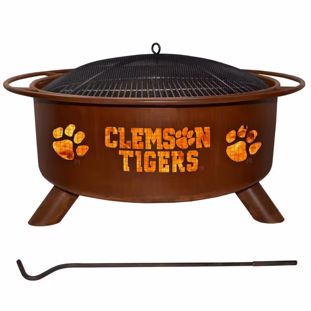 None Clemson 29 in. x 18 in. Round Steel Wood Burning Fire Pit in Rust with Grill Poker Spark Screen and Cover