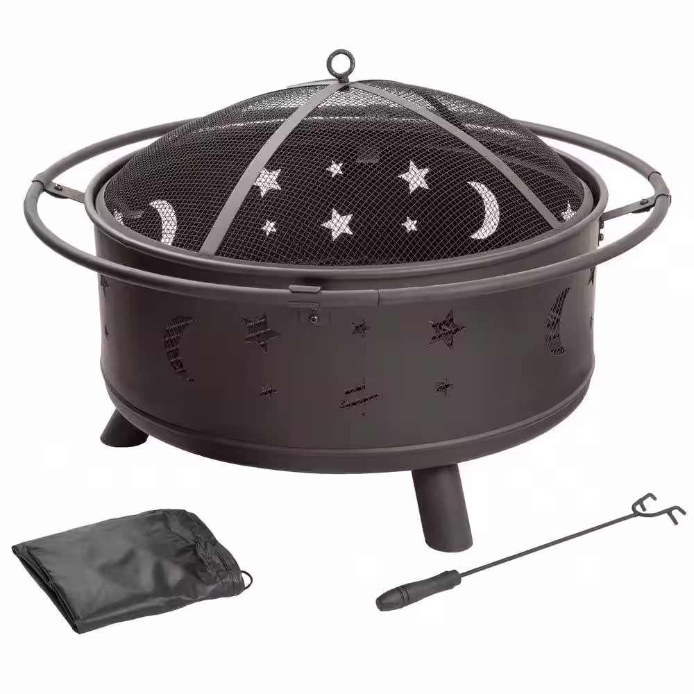 Pure Garden 30 in. Round Steel Star and Moon Firepit with Cover