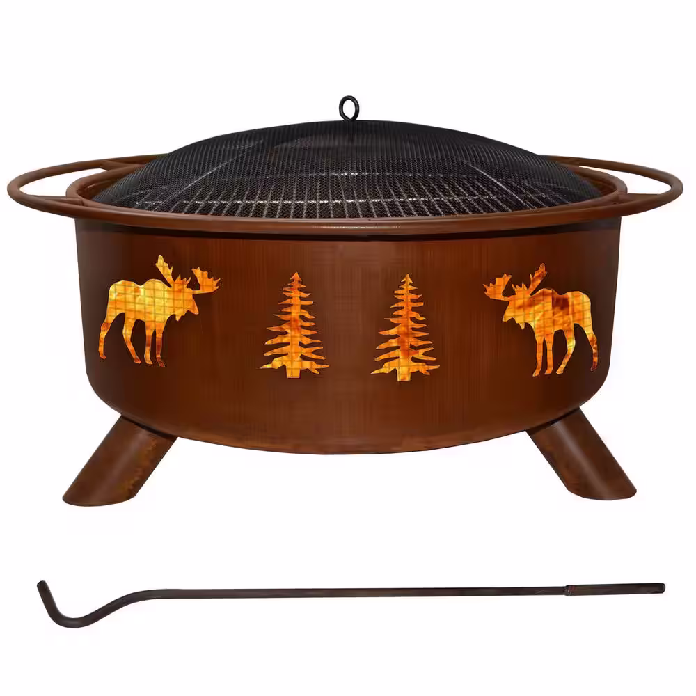 None Moose and Trees 29 in. x 18 in. Round Steel Wood Burning Fire Pit in Rust with Grill Poker Spark Screen and Cover