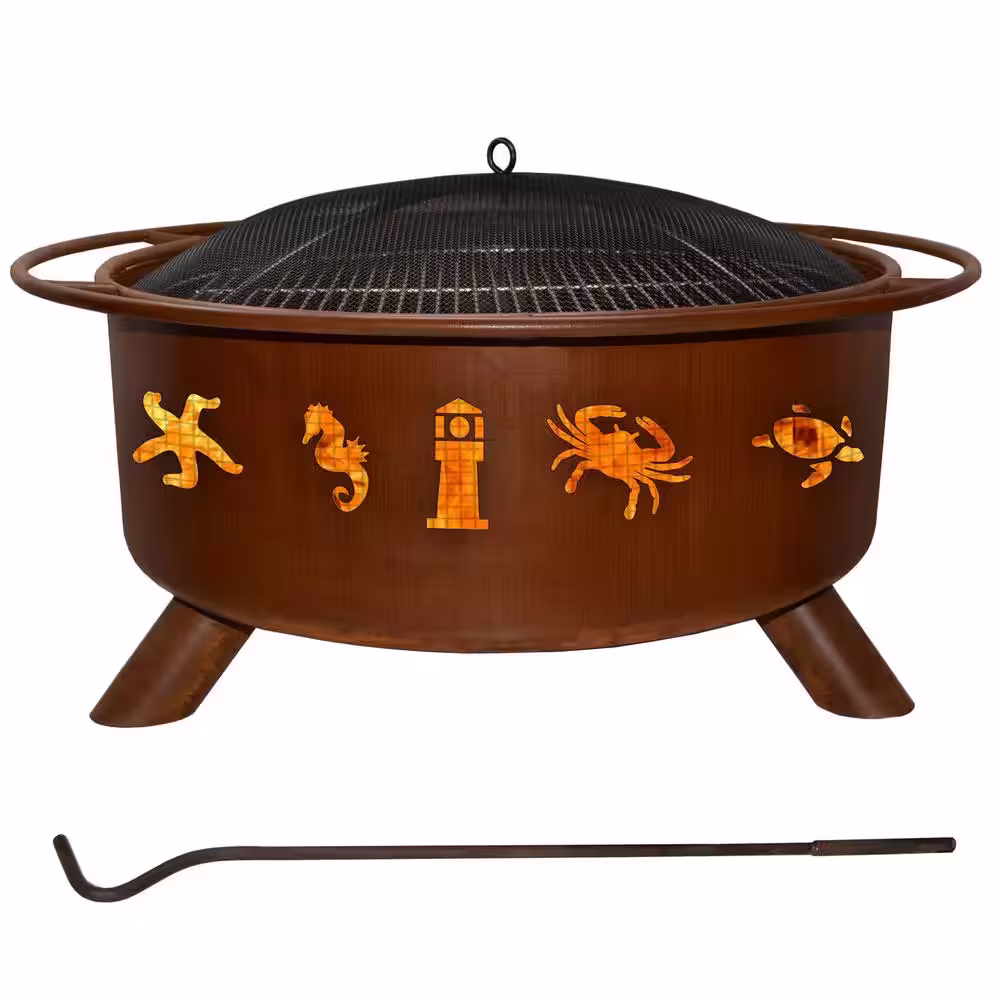 None Atlantic Coast 29 in. x 18 in. Round Steel Wood Burning Fire Pit in Rust with Grill Poker Spark Screen and Cover
