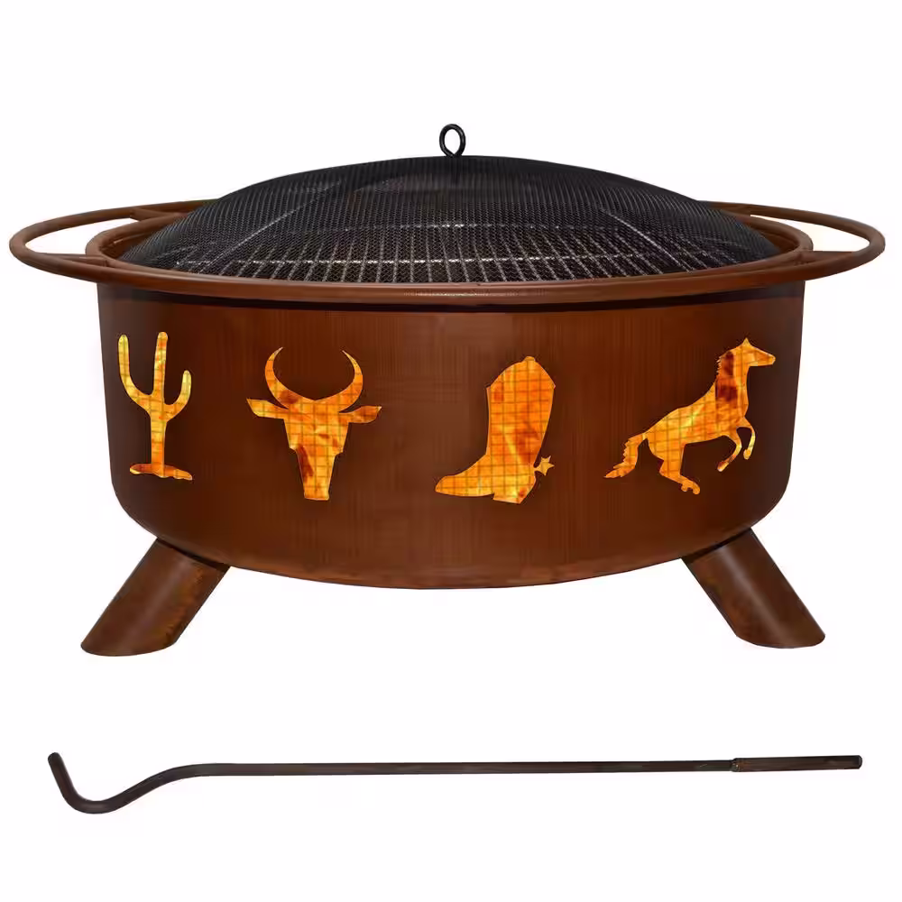 None Western Cowboy 29 in. x 18 in. Round Steel Wood Burning Fire Pit in Rust with Grill Poker Spark Screen and Cover