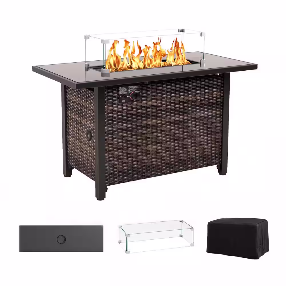None 43 in. Dark Brown Rectangular Rattan Propane Gas Fire Pit Table 50,000-BTU with Ceramic Tabletop Water-Resistant Cover