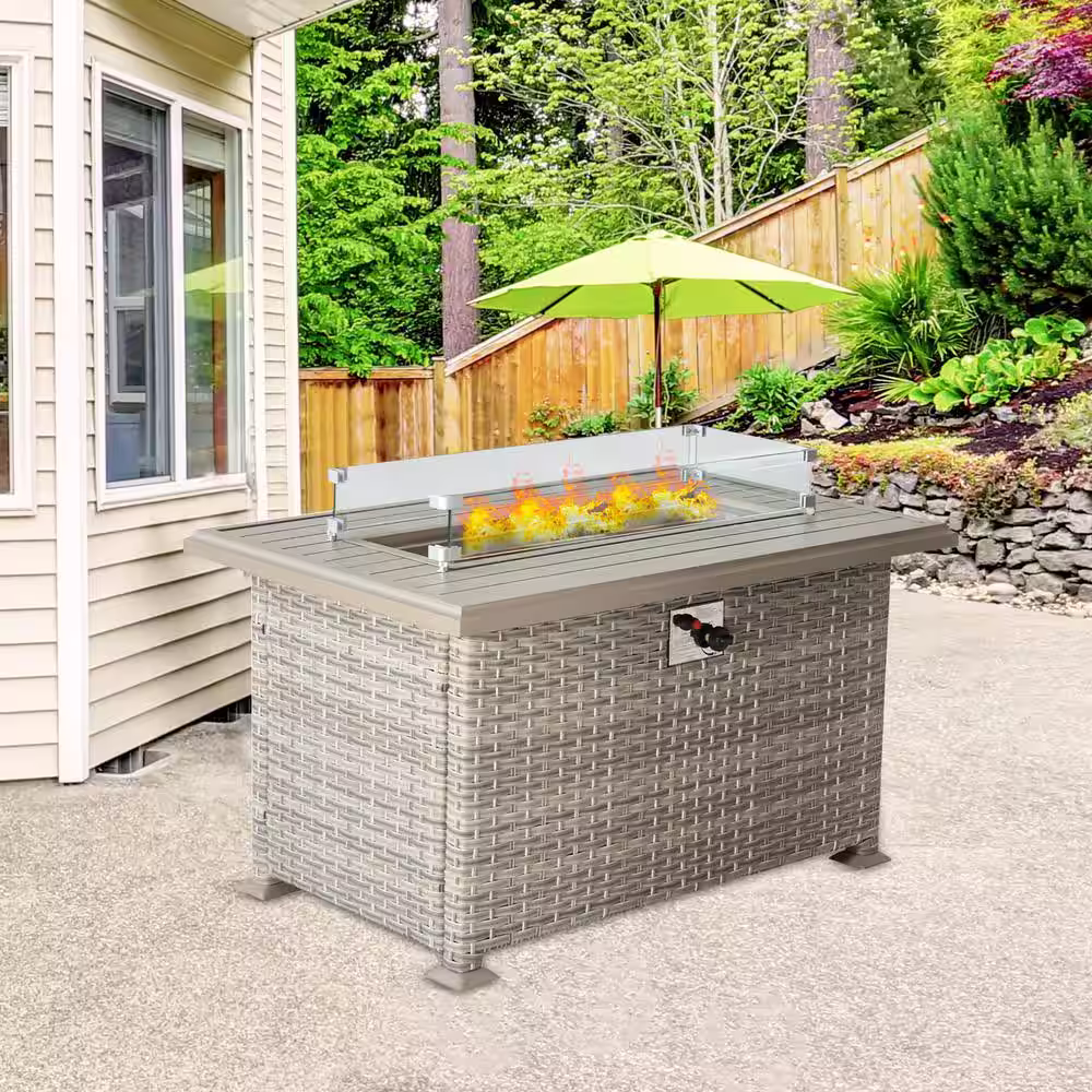 None 44" Aluminum Propane Fire Pit Table with Faux Ledgestone 50,000 BTU Gas Fire Table Waterproof Cover Glass Rock Chocolate