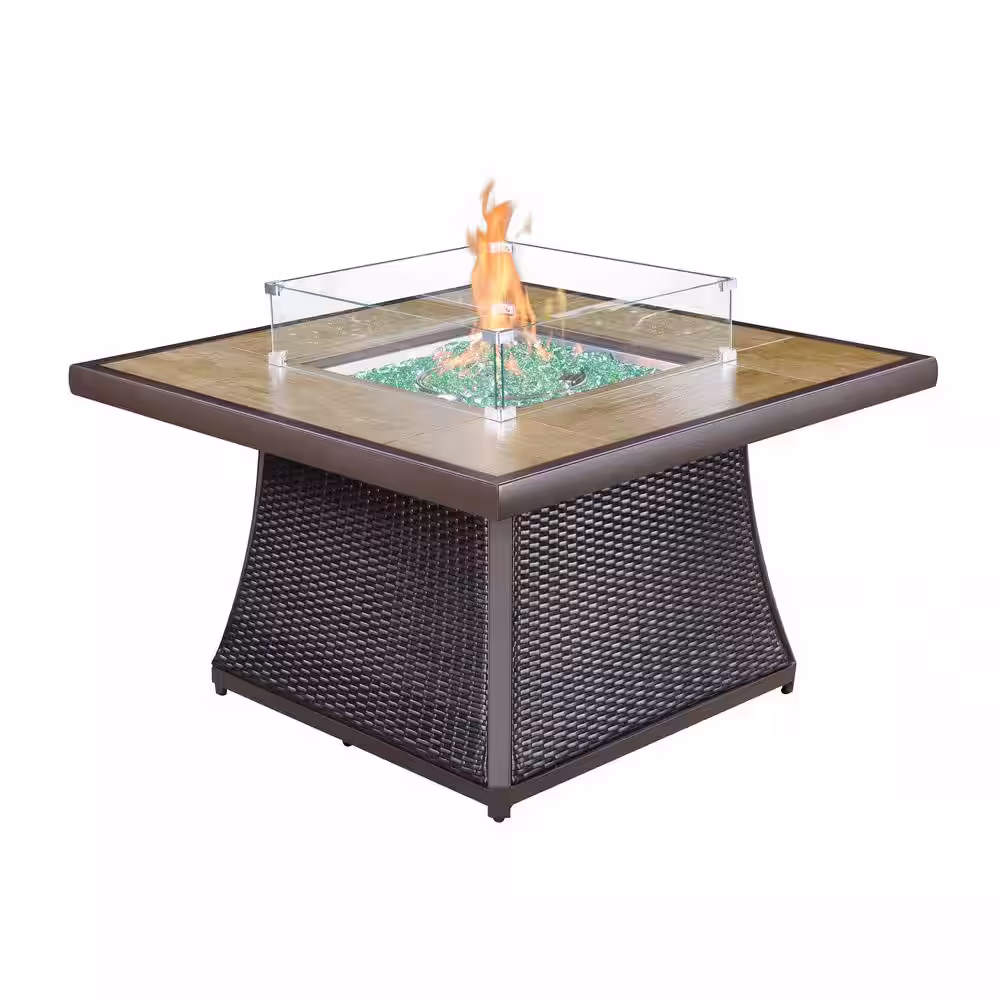 None Elio 42 in. W x 24.6 in. H Square Propane Gas Brown Aluminum Frame Rattan Wicker Tile Top Fire Pit Table