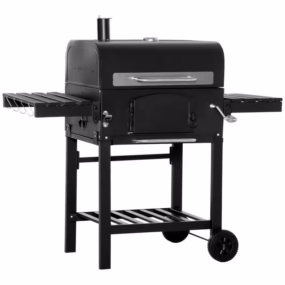 Outsunny Metal Charcoal Smoker in Black Grill BBQ with Adjustable Height and Folding Shelves