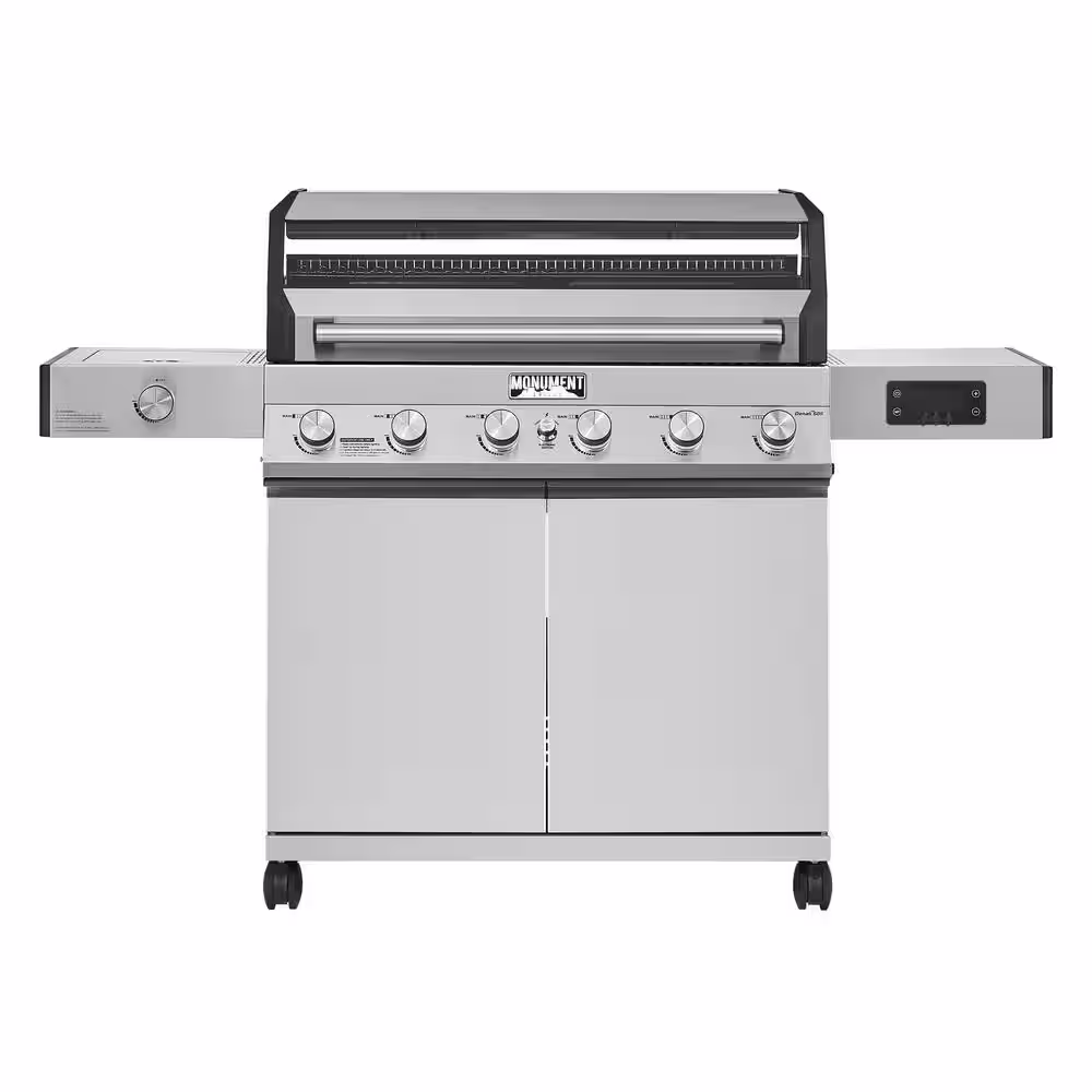 Monument Grills Denali 6-Burner Propane Gas Grill in Stainless with Clearview Lid, 3-Phase LED Controls and Side Burner Box A