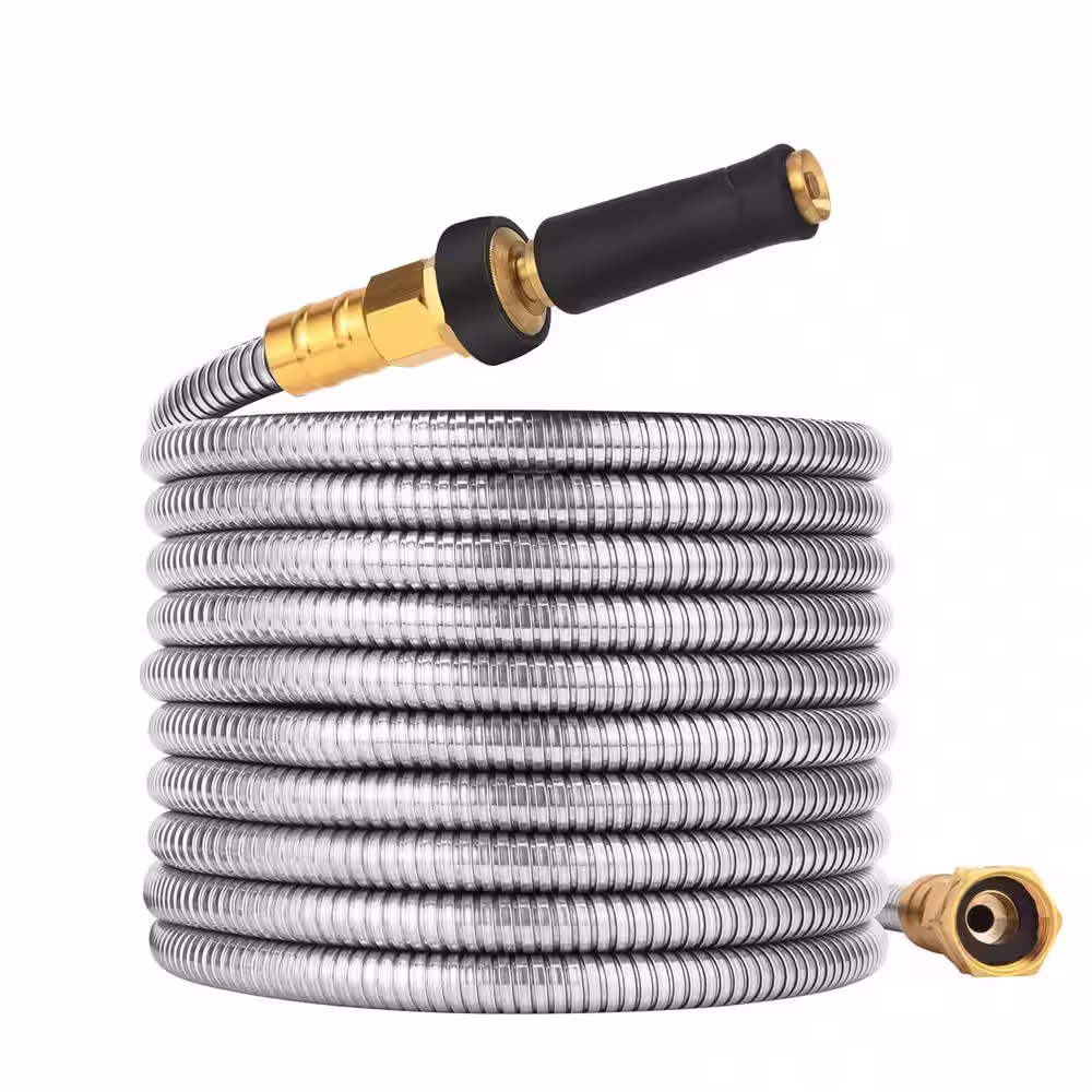 None 1/2 in. x 25 ft. Stainless Steel Garden Hose Set with Solid Brass Nozzle Outdoor Hose, Standard