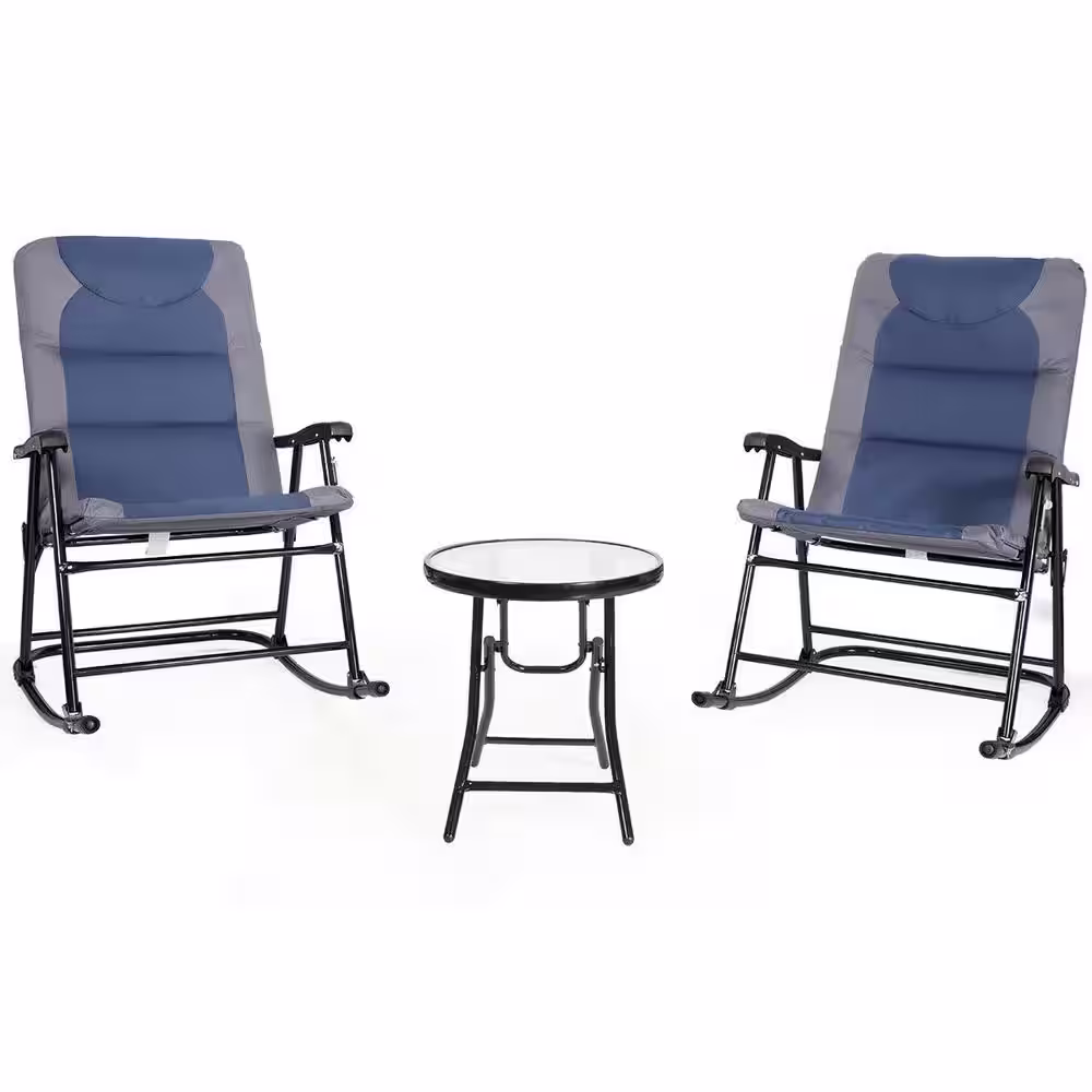 None 3-Piece Metal Outdoor Bistro Set Folding Rocking Chair Table Set with Blue Cushion