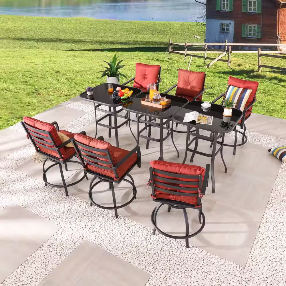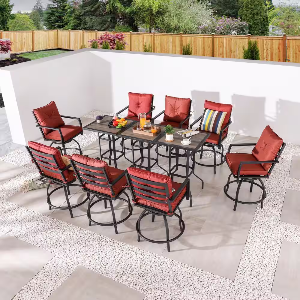 Patio Festival 9-Piece Metal Bar Height Outdoor Dining Set with Red Cushions