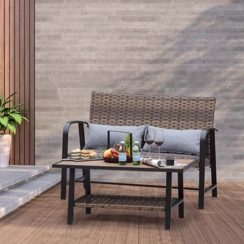 None Black 2-Piece Wicker Outdoor Bistro Set with Gray Cushions