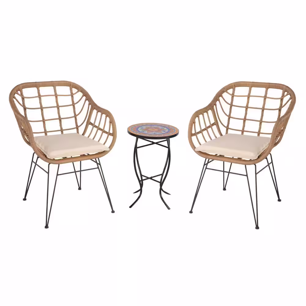 maocao hoom Brown 3-Piece Wicker Outdoor Bistro Set with White Cushions