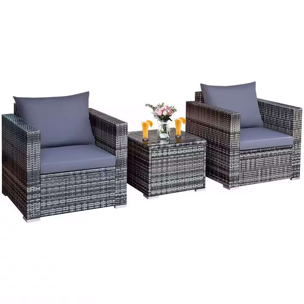 Costway 3-Piece Patio Wicker Furniture Outdoor Bistro Set Cushioned Sofa Chair Glass Table Garden with Gray Cushions
