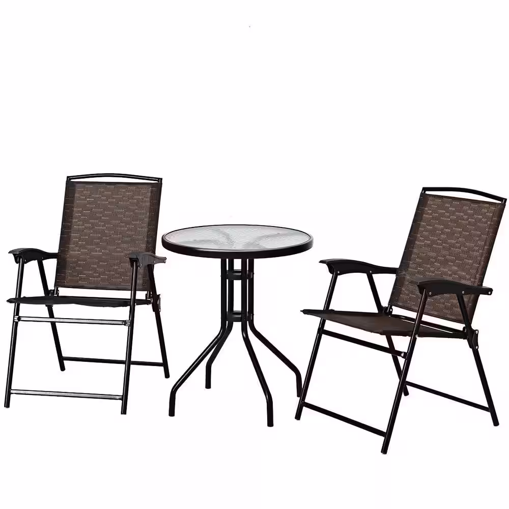 Alpulon Brown 3-Piece Metal Round Outdoor Bistro Set Patio Pub Dining Set with 2 Folding Chairs & Glass Table