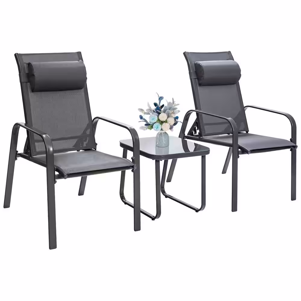 HONEY JOY 3-Pieces Grey Patio Adjustable Back Stackable Chairs Side Table Set Outdoor Bistro Set Classic Furniture Set