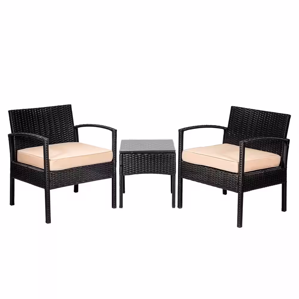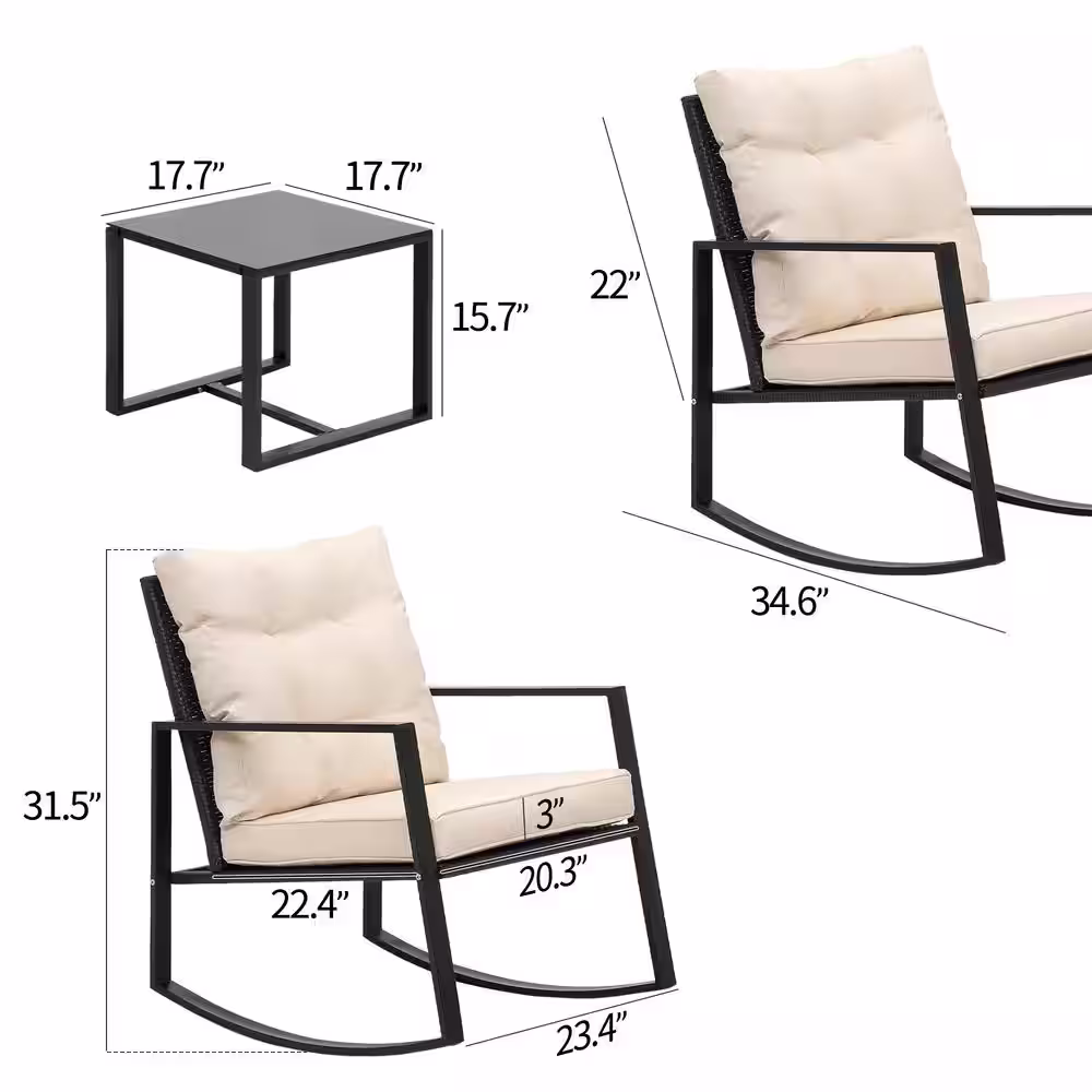 JUSKYS Black 3-Piece Wicker Outdoor Bistro Set Rocking Chairs with Beige Cushion