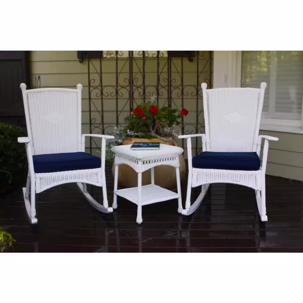Tortuga Outdoor Portside Classic 3-Piece White Wicker Outdoor Rocking Chair Set with Patio Side Table and Plush Navy Cushions