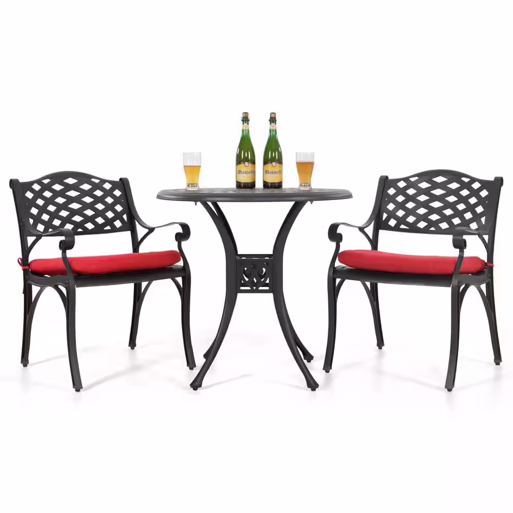 Nuu Garden 3-Piece Black Cast Aluminum Patio Round Outdoor Bistro Set with Red Cushions