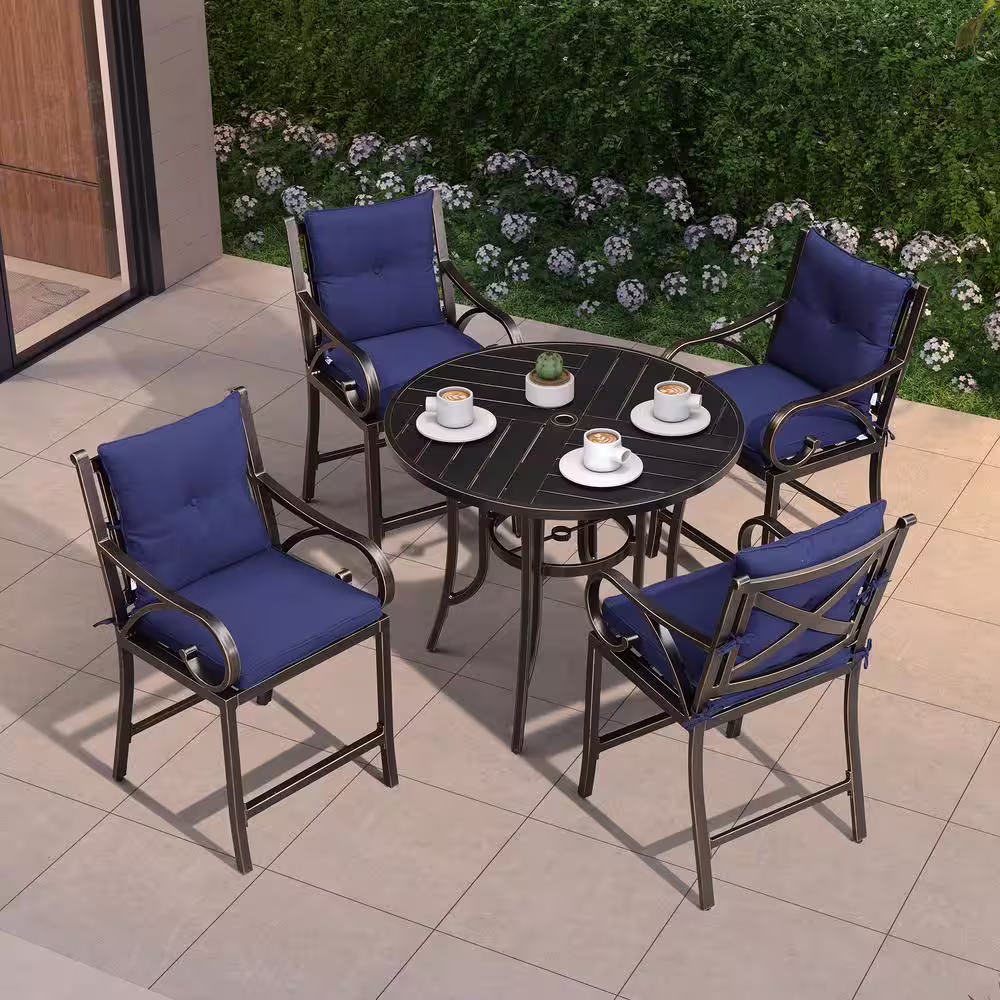 PURPLE LEAF Modern 5-Piece Cast Aluminum Outdoor Bistro Set with Back and Arm Navy Blue Cushion Counter Height Metal Bar Chairs