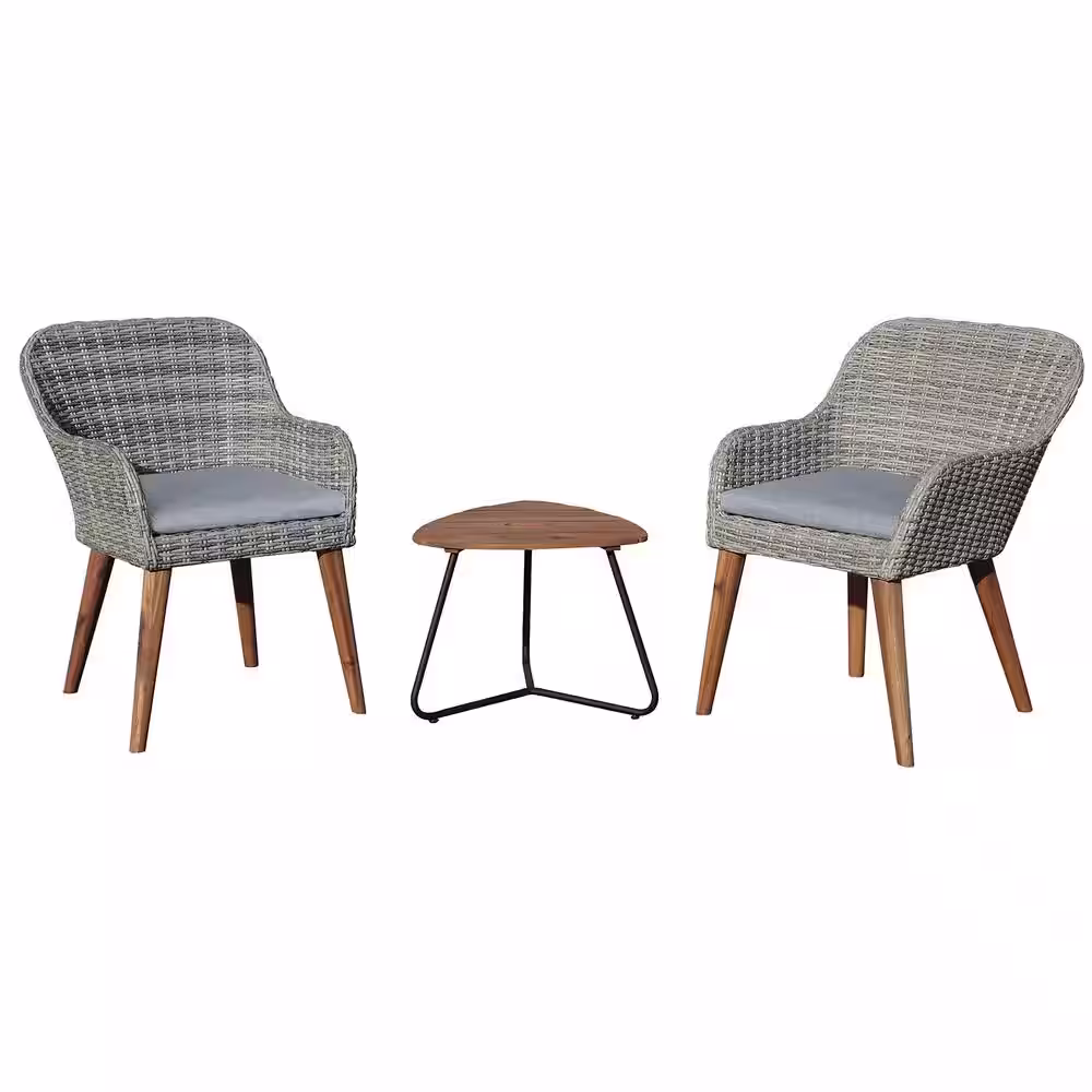 Noble House Gray 3-Piece Faux Rattan Round Outdoor Bistro Set with Gray Cushions