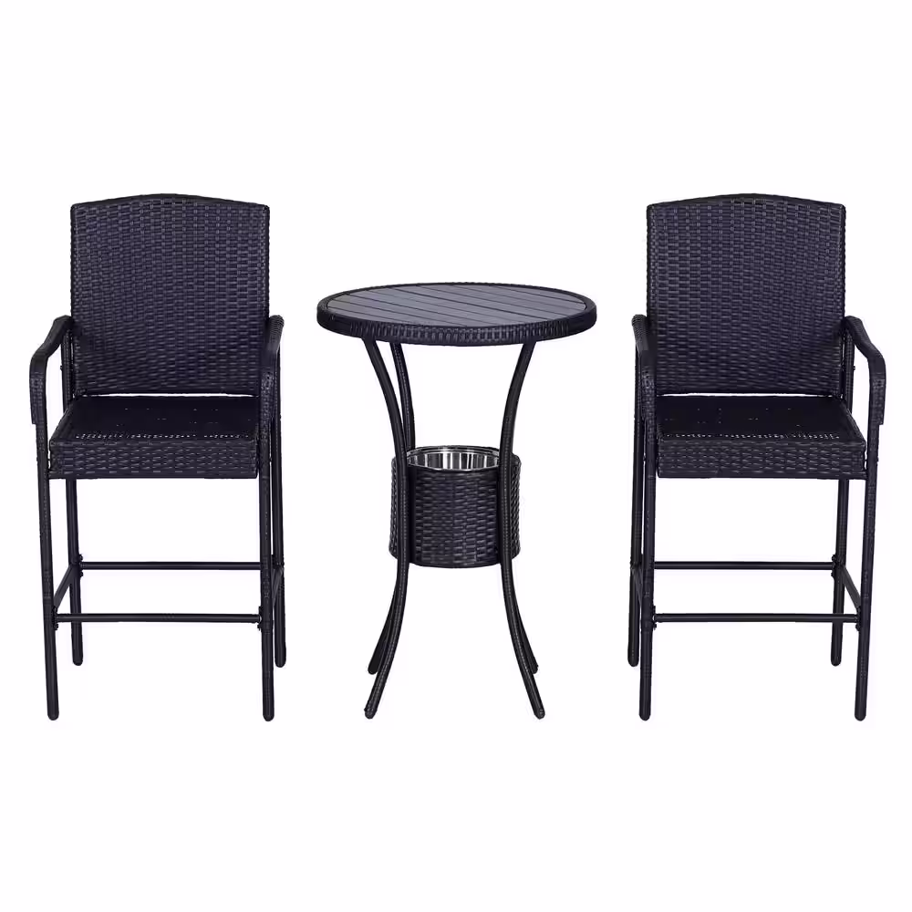 Outsunny 3-Piece Outdoor Plastic Rattan Wicker & Metal Frame Bistro Set with Included Ice Buckets, Bar Stools, and Center Table