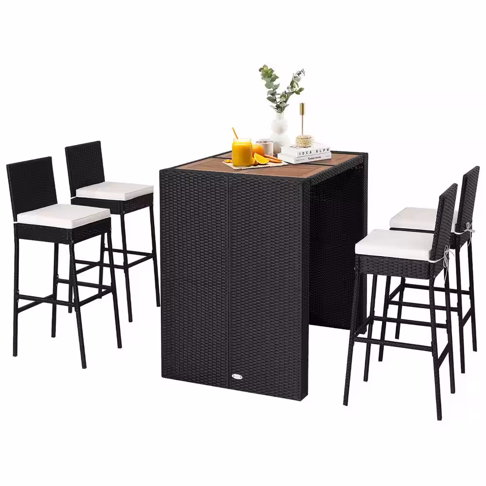 Costway 5-Piece Patio PE Wicker Bar Set Outdoor Acacia Wood Dining Table Stool Bistro