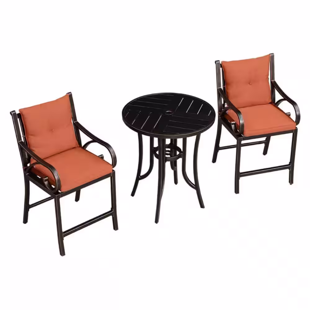 PURPLE LEAF Modern 3-Piece Cast Aluminum Outdoor Bistro Set with Back and Arm Brick Red Cushion Counter Height Metal Bar Chairs