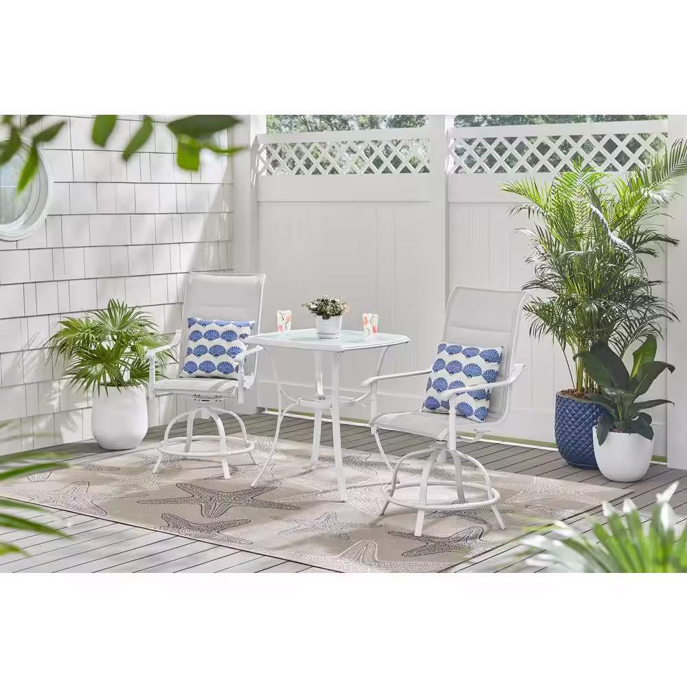 Hampton Bay Ashbury White 3-Piece Steel Padded Sling Square Glass Top Outdoor Bistro Set