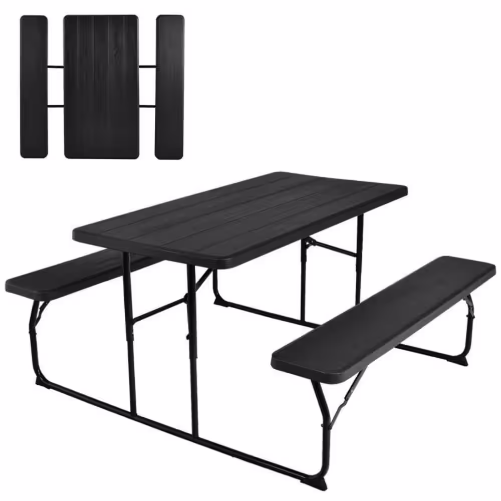 Clihome Black Rectangle Plastic Outdoor Folding Picnic Table Bench Set with Wood-Like Texture