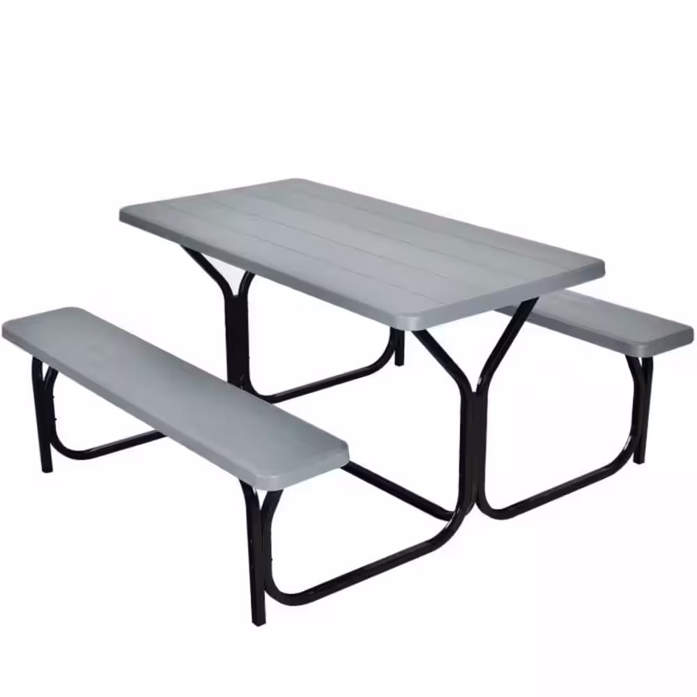 Clihome 54 in. x 59 in. x 28.5 in. Gray HDPE Rectangle Picnic Table Bench Set with Metal Base for Outdoor Camping All Weather